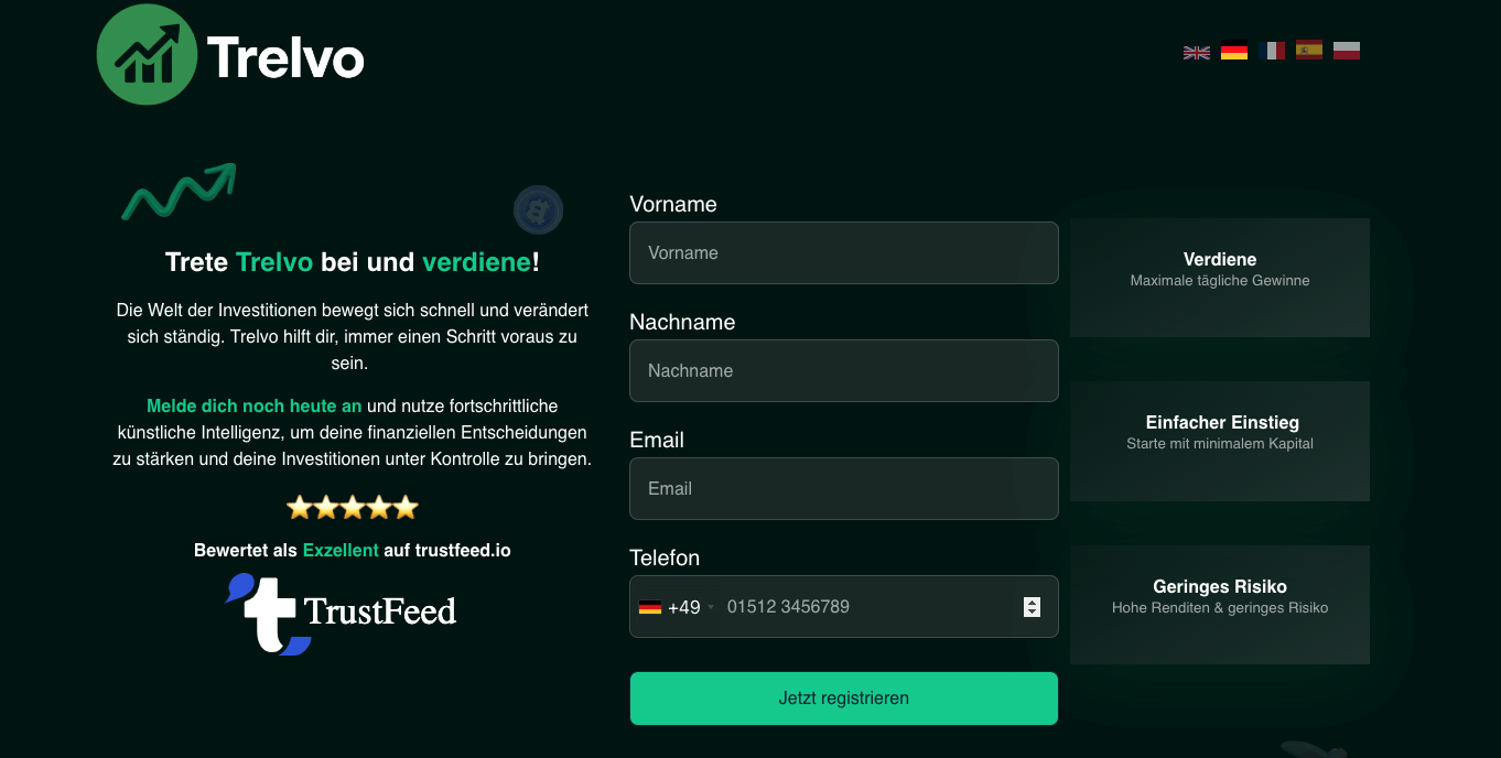 Der Hauptvorteil dieser Web-Handelsplattform Trelvo besteht darin, dass es Forex-Händlern gelingt, an ihre Ziele zu gelangen.Sie können auf viele Bildungsressourcen zugreifen und erhalten Zugang zum Markt und seiner Analyse als Ergebnis der von dieser Handelsplattform angebotenen Instrumente und Händlern kann viele Informationen über den Devisenmarkt erhalten. Darüber hinaus werden sie über die makro- und mikroökonomischen Faktoren aufgeklärt, die den Markt beeinflussen. Infolgedessen kann das Trelvo Bewertung den Devisenhändlern wertvolle Einblicke und Ratschläge geben. Zu wissen, wie wichtig Weiterbildung und persönliches Wachstum im Devisenhandel ist, eine stark anpassbare Handelsplattform und eine Vielzahl von verschiedenen Tools an diese Bedürfnisse anzupassen und sicherzustellen, ist eine großartige Möglichkeit, diese Anforderungen zu erfüllen. So haben Sie als Devisenhändler Zugriff auf Schulungsressourcen und Tools, die Ihnen helfen, ein besserer Händler zu werden.